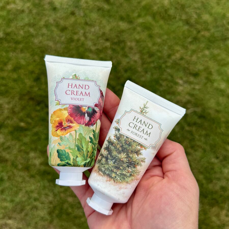 Jemné hydratační krémy pro ženy i muže. Krém Violet si zamilujete již po prvním doteku. Zanechává ruce hebké a vyživené, aniž by zůstaly mastné. Jeho vůně fialek je něžná, elegantní, taková procházka jarní zahradou po dešti. Krém Forest a jeho vůně lesa vás zklidní i osvěží. Tento hydratační krém s vůní čerstvého dřeva a zelených tónů chrání pokožku před vysušením. Ruce zanechává provoněné přírodou. Ideální jako dárek pro ni a pro něj.