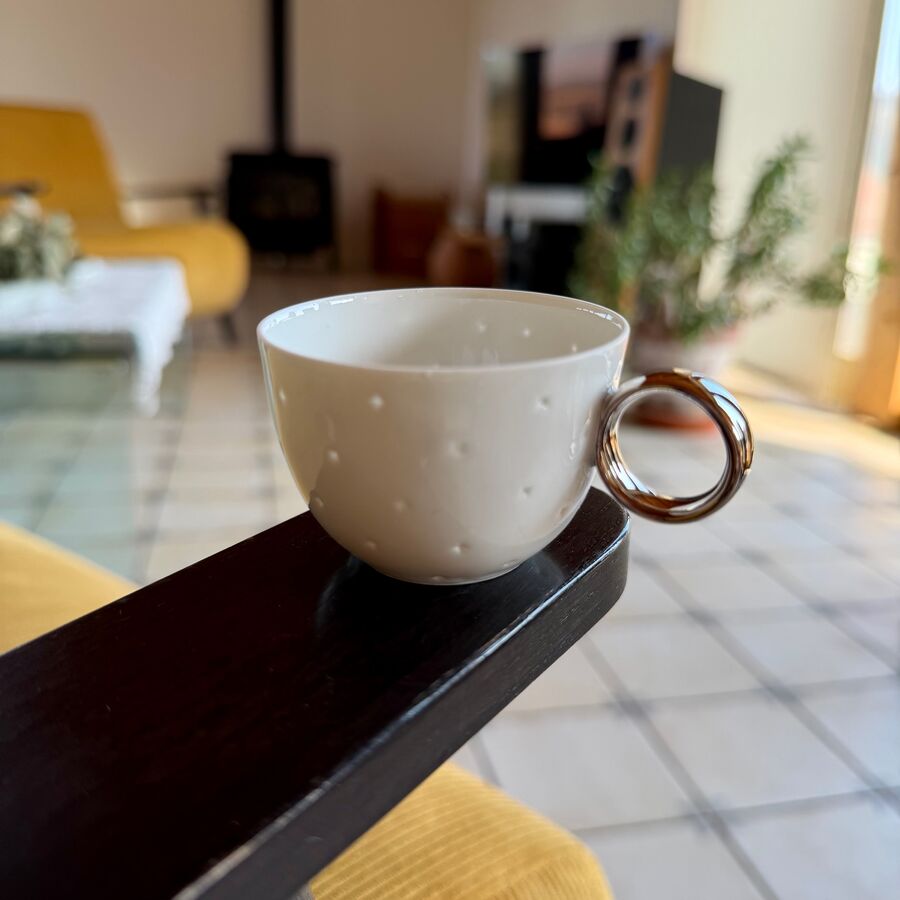 Autorský porcelán brněnské autorky Radky Linhartové. Hrneček určený na espresso, espresso macchiato, ristretto je naprosto nezaměnitelný. Osobitý styl autorky, čistota provedení, dokonalé linie, jedinečné estetično vám z obyčejného hrníčku udělají Váš a jenom Váš hrníček. Některé předměty totiž mají duši.