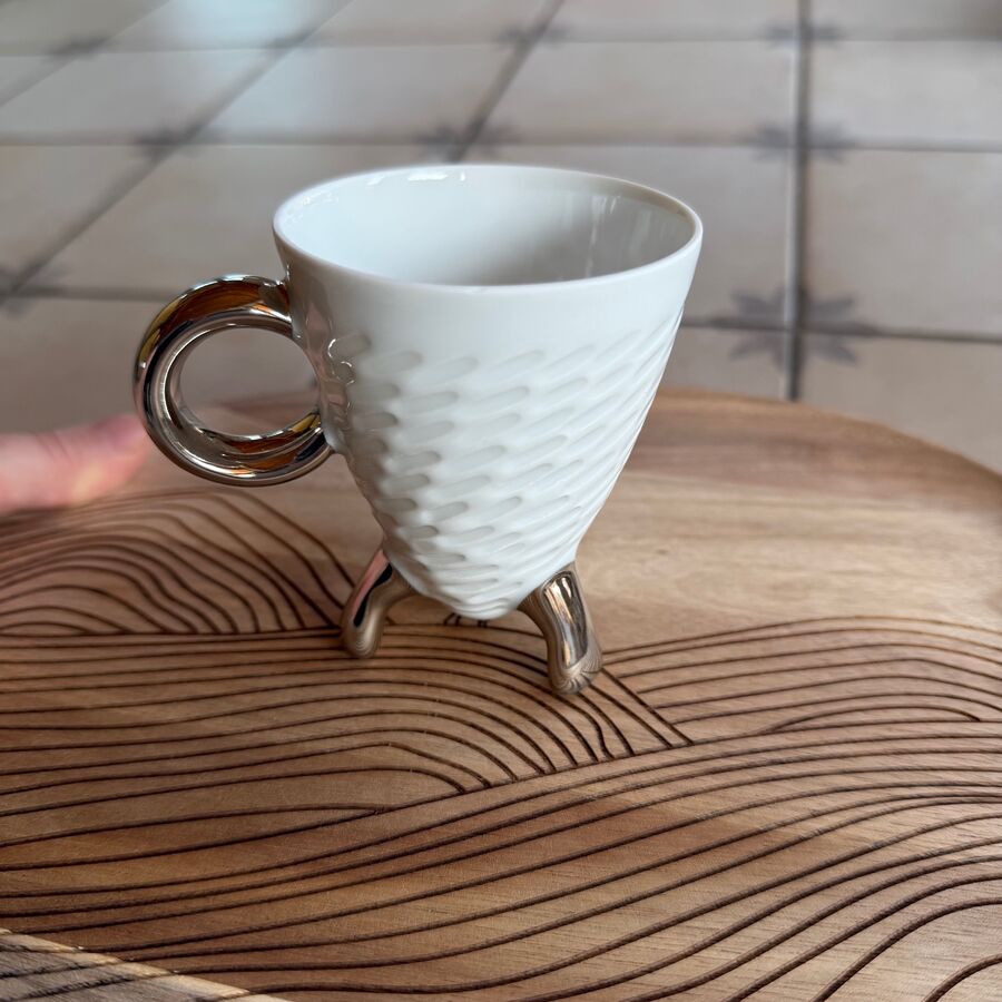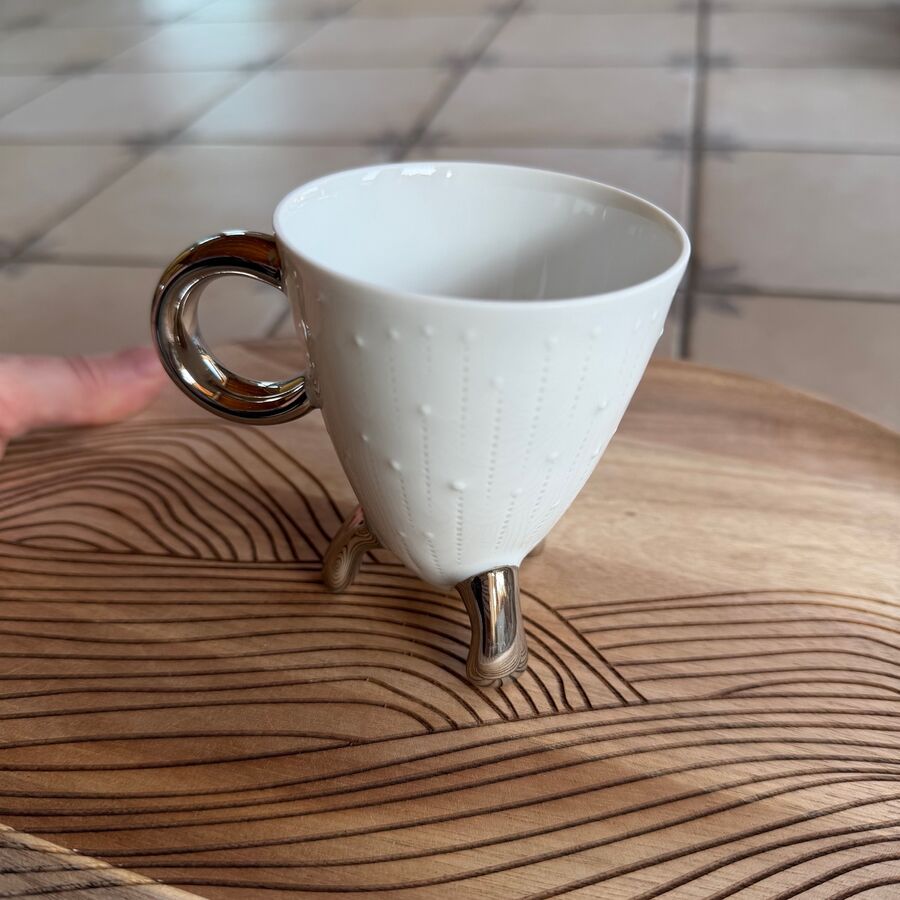 Autorský porcelán brněnské autorky Radky Linhartové. Šálek trojnožka ve velikosti ideální na espresso, double espresso a ristretto je naprosto nezaměnitelný. Osobitý styl autorky, čistota provedení, dokonalé linie, jedinečné estetično. Je tak lehounký a krásný, že jakmile si na něj zvyknete, Vaše oblíbená káva už Vám z jiného chutnat nebude...Velmi oblíbený mezi muži.