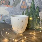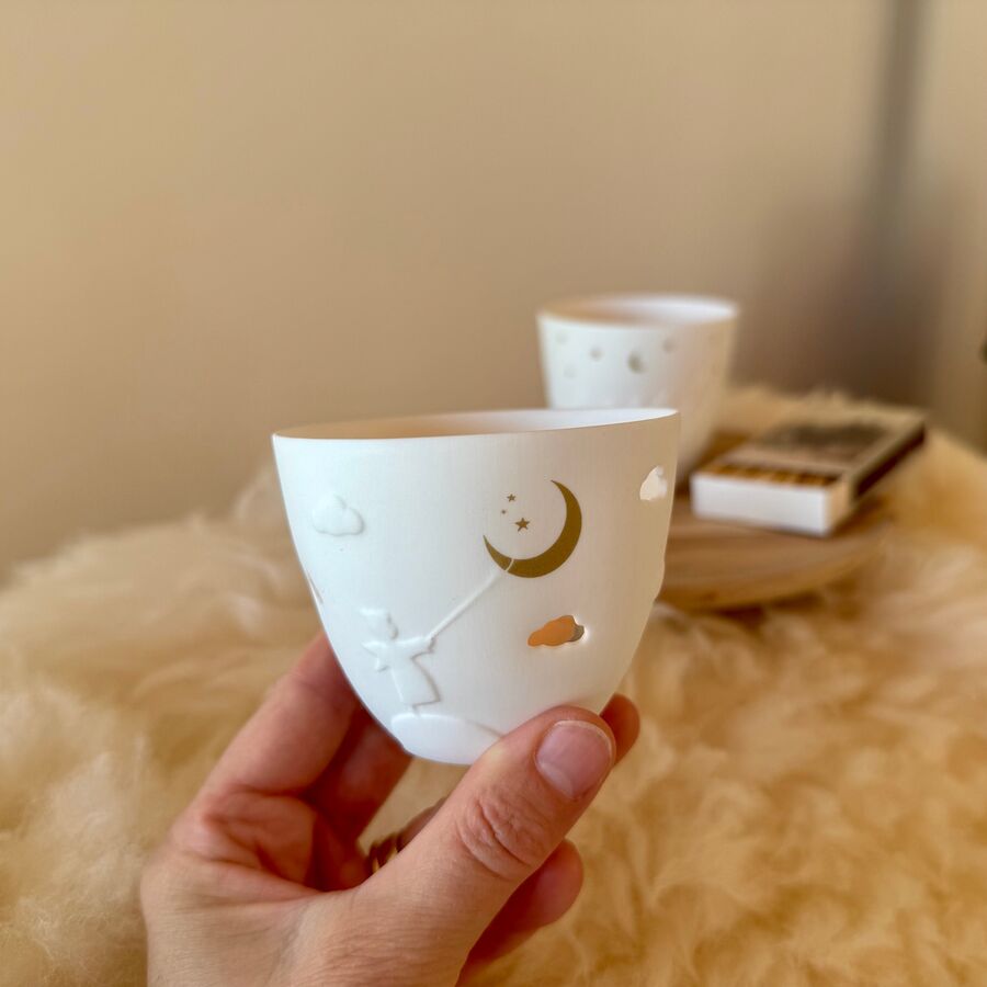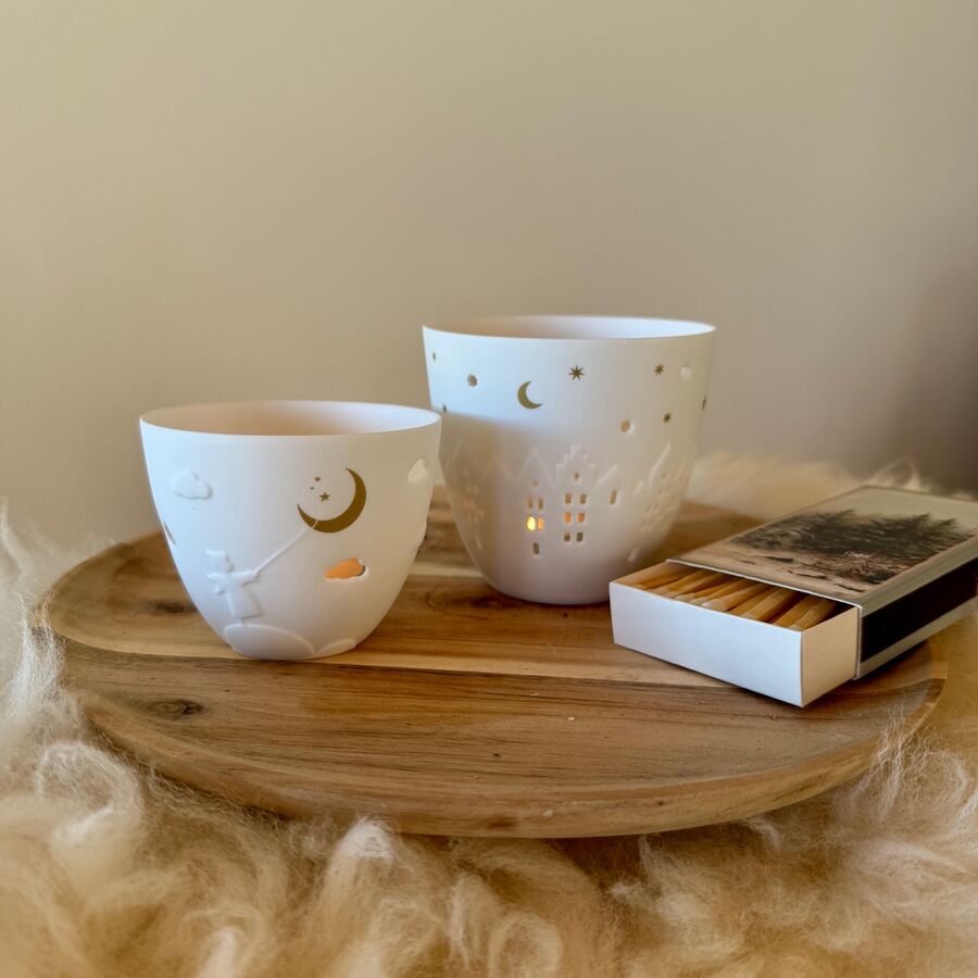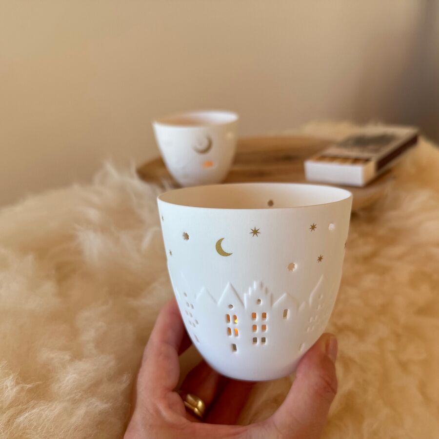 Jemný, děrovaný, porcelánový svícen s motivem městečka a noční oblohy a o něco menší porcelánový svícen s motivem andílka. Zapálit svíčku a schoulit se do deky. Svícny od německého designového výrobce Raeder jsou skutečně výjimečné. Hledáte dárek pro vaše společné chvíle? U tohoto svícnu neváhejte. Navodí Vám úžasnou atmosféru! Idealní do podzimích a zimních dnů.