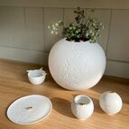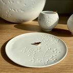 - Materiál: porcelán, neglazovaný, s raženými lístky a ručně malovaným zlatým ptáčkem