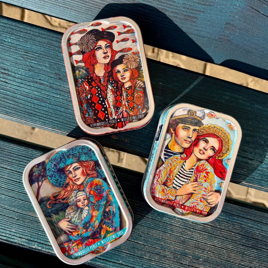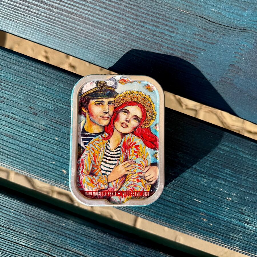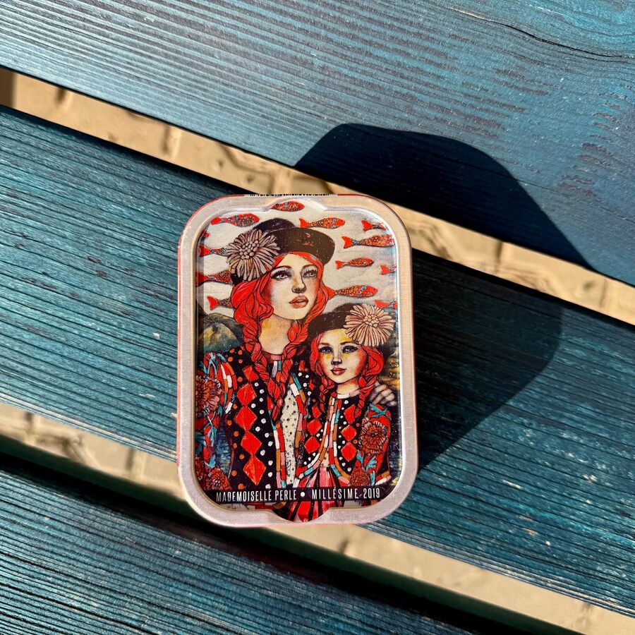 Výjimečné sardinky z francouzského pobřeží Atlantiku od tradiční konzervárny. Sardinky jsou loveny v hlavní sezóně, ručně zpracovány tradiční metodou a konzervy se plní jen pár kilometrů od přístavu. Každá konzerva patří do kolekce Mademoiselle Perle, která spojuje gastronomii a umění. Plechovky zdobí ilustrace francouzské výtvarnice Delphine Cossais.