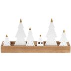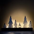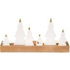 Jemné porcelánové prvky - perforované porcelánové stromečky a domeček se zlatými špičkami usadíte do dřevěné základny z akátového dřeva. Umístit je můžete v různém pořadí, jak se vám zlíbí. Zapálíte čtyři čajové svíčky. A pak už se jen kocháte! Vytváří kouzelné světelné a stínové efekty, pravá zimní romantika.